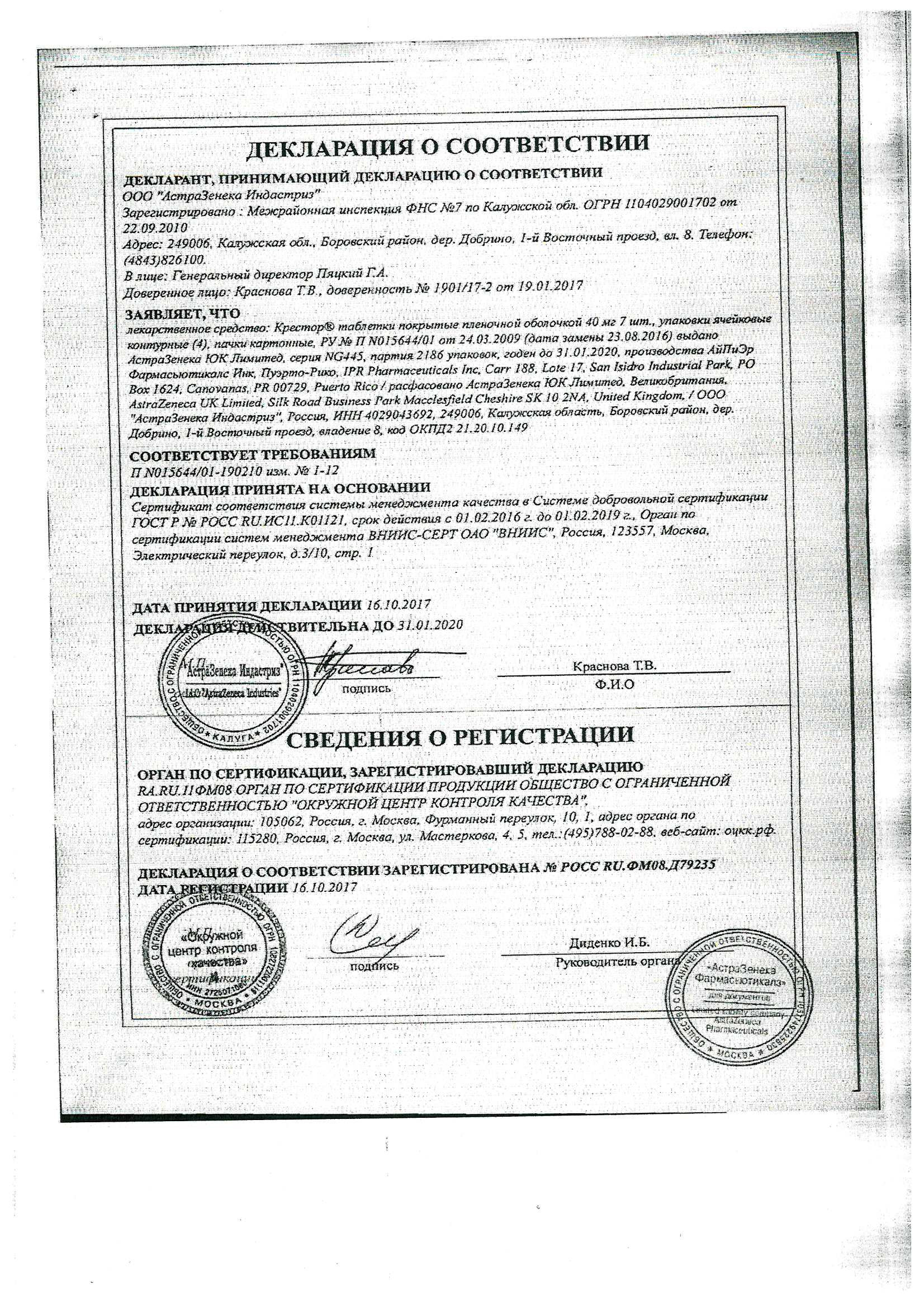 Купить Крестор 40 мг в аптеке можно только после предоставления рецептурного листа.