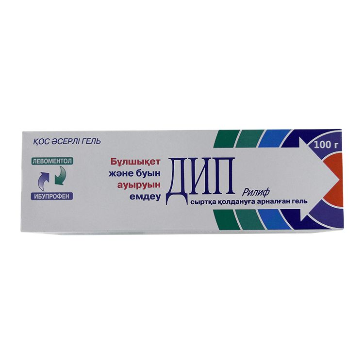 Препарат поставляется в тубе объемом 100 г, которая помещена в картонную коробку. На упаковке четко указаны название препарата "Дип Рилиф", основные активные компоненты (левоментол и ибупрофен), а также рекомендации по применению для лечения боли в мышцах и суставах. На коробке и тубе указаны все необходимые маркировки: дозировка, объем, логотип производителя и информация о составе.