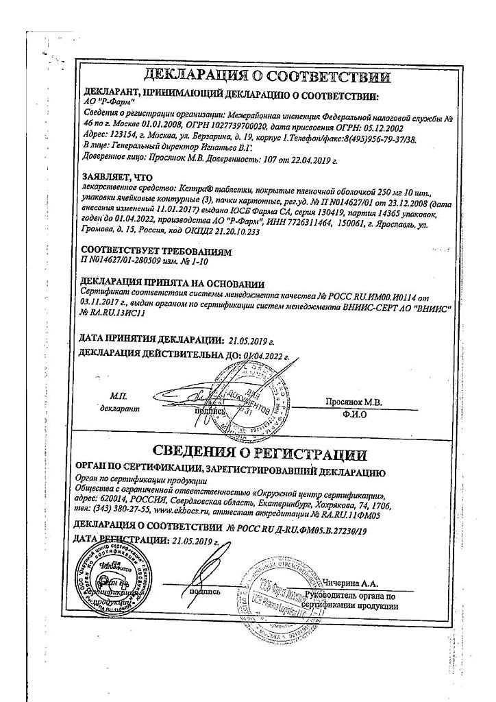 Таблетки синего цвета, продолговатой формы, покрытые пленочной оболочкой, с риской и надписью «UCB» и «250» на одной стороне. Целью насечки является облегчение разлома таблетки только для проглатывания, а не разделение таблетки на равные дозы.