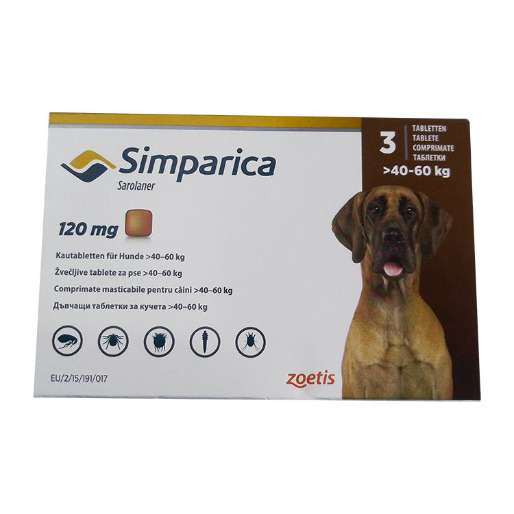 Симпарика идёт в коробке с указанием дозы 120 мг и рекомендациями по применению для собак весом от 40 до 60 кг. В комплекте – три таблетки в герметичных блистерах.